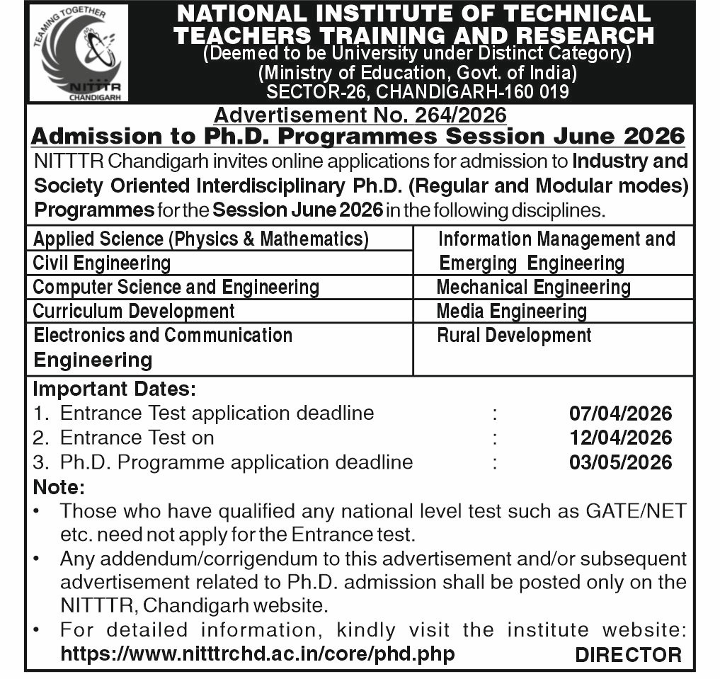 For any information related to the PhD Admission at NITTTR Chandigarh, contact: